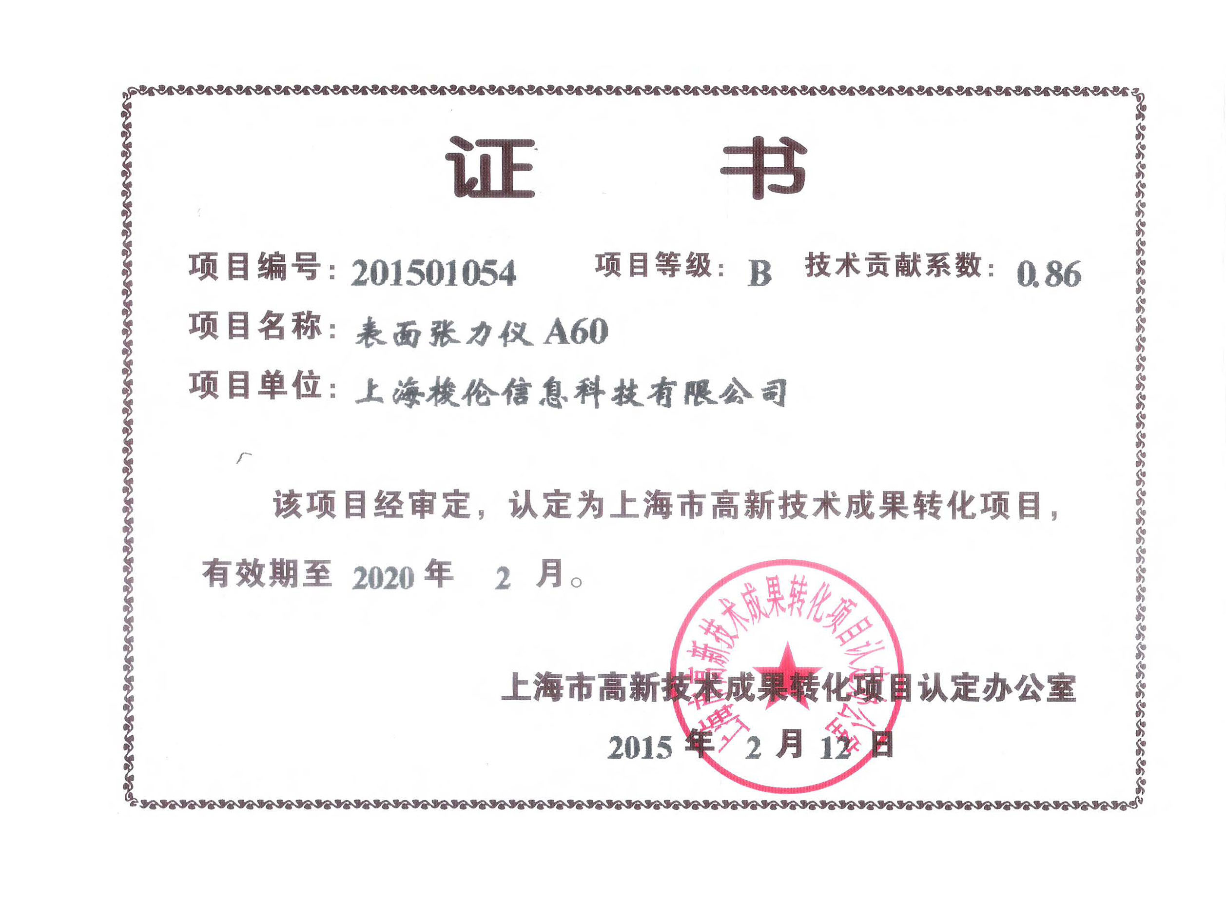 热烈祝贺上海梭伦科技表面张力仪获上海市高新成果转化项目证书。这是国家权威机构对我们技术以及产品的全面认可,也是上海梭伦的荣誉。 上海梭伦为美国科诺中国战略投资公司,专业研制表面张力仪、界面张力仪和接触角仪。目前,全系列产品均已经获得上海市高新成果转化项目认证通过。界面张力仪TX500系列,接触角仪SL200系列以及新通过的表面张力仪A60系列,全面采用了上海梭伦的各项专利技术,从而为保证我们的技术先进性、产品创新性。 我们将加大研发投入,研制出更多符合用户需求的,性价比高的产品。 2015年,新投入的产品包括了三液滴法接触角和表面自由能分析模块以及超高压、高温旋转滴界面张力仪TX500HP。欢迎来电咨询相关产品信息。