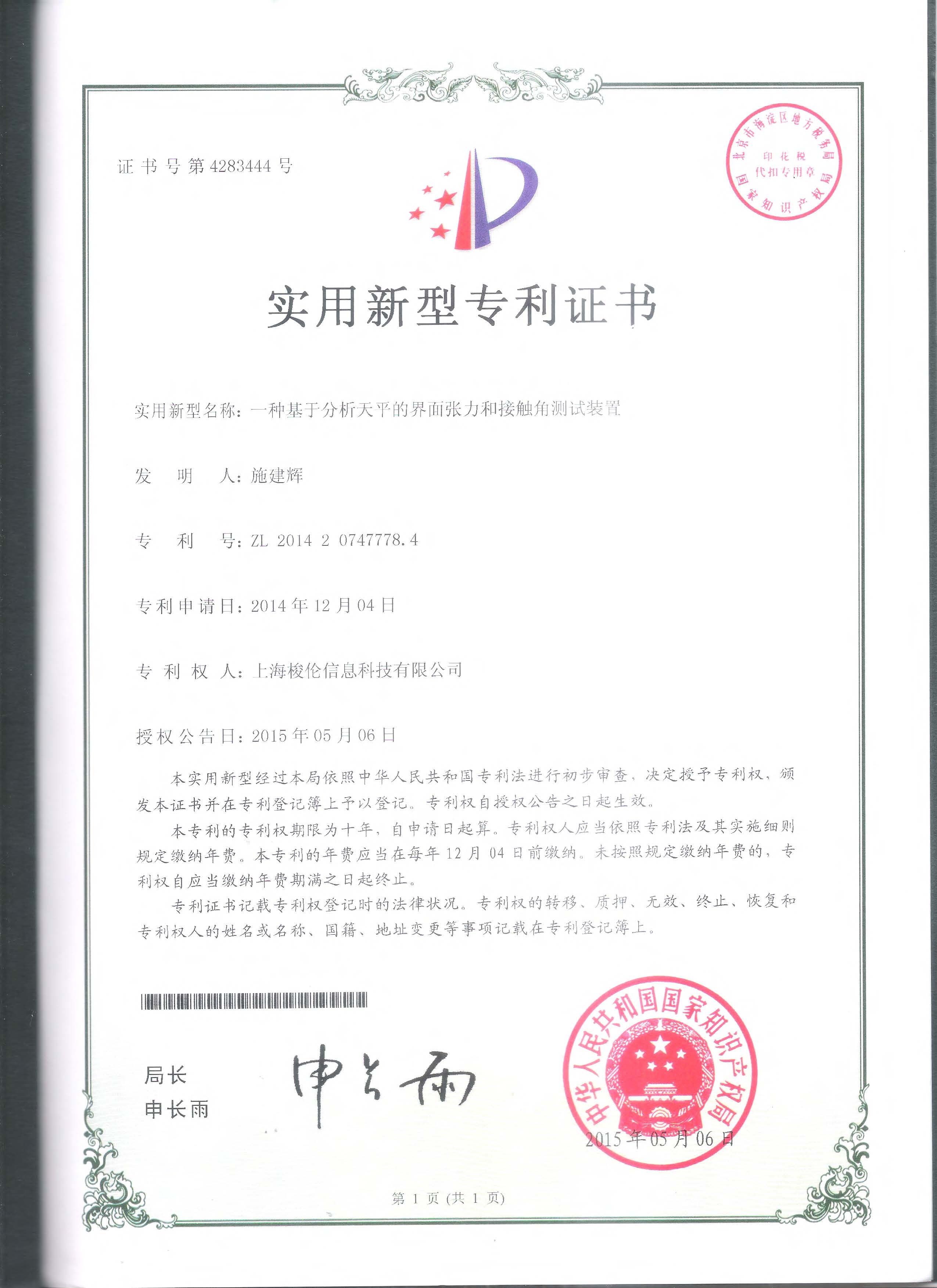 2015年,在美国科诺工业有限公司和上海梭伦信息科技有限公司国内外研发团队的紧密合作下,长期以来困扰称重原理下(我们称为Wilhelmy Plate method)无法准确测试油-水界面张力的问题得到了彻底解决。在原有的第一代或改进的白金板法技术中,由于无法修正接触角值,从而导致测试的油-水界面张力值经常出现很小的值如2,3mN/m或甚至是负值。而根据文献资料或采用光学的悬滴法界面张力测试软件如美国科诺工业有限公司的ADSA-RealDrop软件,则可以很准确的测得与文献值一样的数据。通过长期研究,我们将Young-Laplace方程引入到了Wilhelmy plate method的计算公式中,并采用分析天平的润湿板的速度,计算得到相应的接触角值以及润湿高度值,最终计算得出相应的表面张力值或界面张力值。这种方法,从根本上解决了接触角和浮力修正的问题,也真正实现了测试油-水界面张力的目的。最近,我们测试了含氟表面活性剂溶液(表面张力值为18mN/m)与汽油的界面张力值,多次重复测试均可以测得2mN/m的结果,重复误差为0.2mN/m以内。测试了两种芳烃类油样与水的界面张力值,表面张力值为28mN/m,油水界面张力值Young-Laplace方程修正的白金板法、白金环法、悬滴法(ADSA-RealDrop软件),均为16mN/m左右。测值效果非常好。
